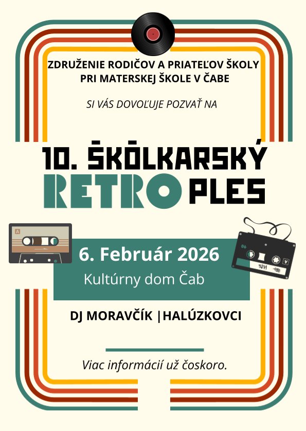 Pozývame všetkých priateľov a známych na 9. Škôlkarský ples, ktorý sa bude konať 14.02.2025 v sále Kultúrneho domu v Čabe. Všetkých, ktorí prídu v maske na tému "ZAMILOVANÉ PÁRY" čaká odmena!